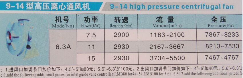 目前市場上常用的五款高壓離心通風機,有9-19高壓離心通風機、9-26高壓離心通風機、9-14高壓離心通風機、XQ型高(gāo)壓離心通風(fēng)機、8-09型高壓離心通(tōng)風機、9-12型高壓離心通風機。廣泛(fàn)應用(yòng)於鍛冶爐、玻璃、電鍍、陶瓷、畜電池、無線電等(děng)行業高壓強製通風,並可廣(guǎng)泛用於糧食、飼料、礦粉等加工行(háng)業的物料(liào)輸送,也適合用於紙箱(xiāng)機構設備、鋼化玻璃設備等配套使(shǐ)用。下(xià)麵就這六款高(gāo)壓離心通風機的詳細參數羅列如下: