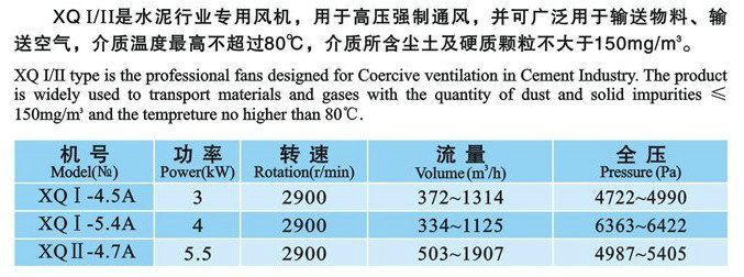 本公司提供的XQ高壓離心通風機,是專為水泥窯係統而設計,也可為各種化鐵爐、熔爐、鍛煉爐鼓風用,輸送空氣及無腐蝕性、不自(zì)燃、含塵(chén)濃度不大於150mg/m3,工作溫度不超過80的介質氣體。
