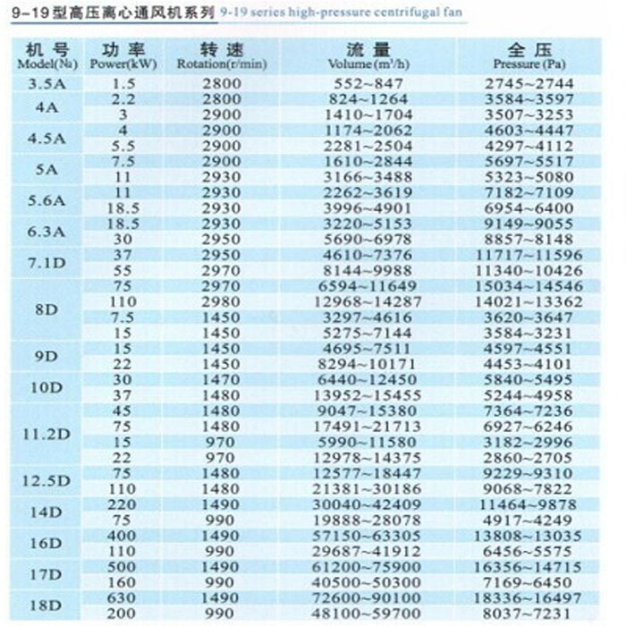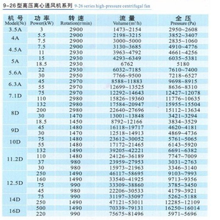 9-19/9-26高壓(yā)離心風機(高壓鼓風機)為單吸入式,主要由葉輪、機殼、進風口、支(zhī)架等組成。主要有13個機號,傳動方式有A式和D式,NO4-6.3號為A式,NO7.1-16號(hào)為D式,由葉輪、機(jī)殼、進(jìn)風口呼傳動組等組成。出風(fēng)口可製成右旋和(hé)左(zuǒ)旋二種方(fāng)式,有(yǒu)0度、45度、90度、135度、180度、225度共6種角度。
